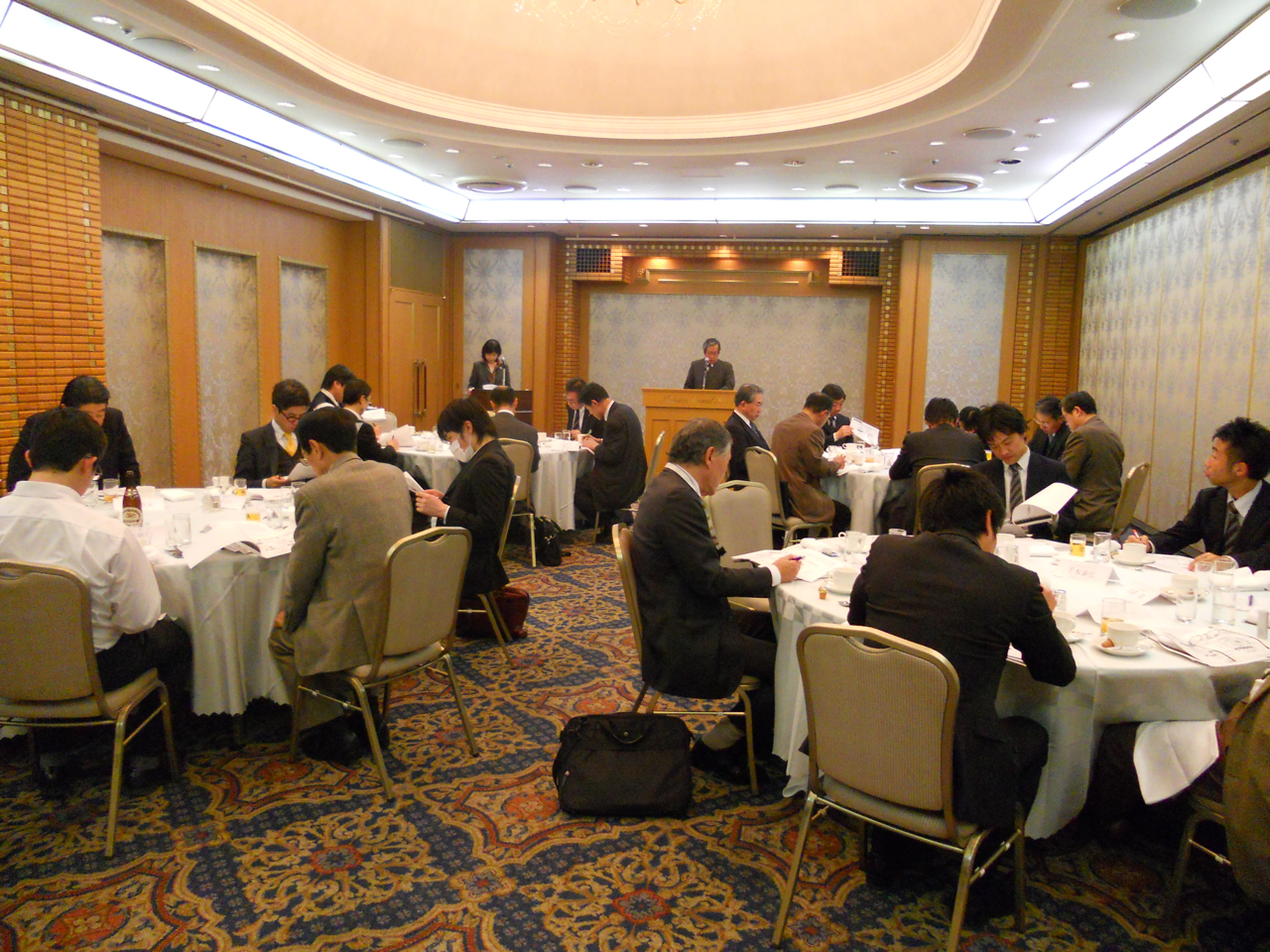 【報告】2012年 第1回目の幹事会が開催されました2012年3月14日(水曜日)、今年第1回目の幹事会が開催されました。今年初めての幹事会は若手事務局の提案を受け、従来の会議形式のテーブル配置を一新し、丸テーブルに出席者全員をランダムに配席して行われました。はじめての試みですが、テーブルごとに新たな交流が生まれ、意外に好評のようでした。