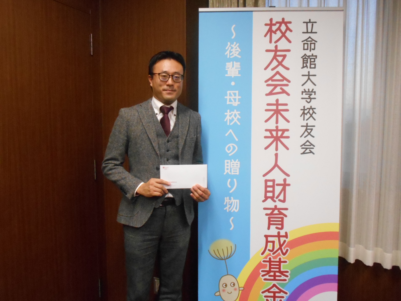 愛知県校友会総会(11月14日)で寄せられた未来人材育成基金8万円が、11月27日、伊藤享司愛知県会長の名代で京都を訪れた林幸雄愛知県名誉会長から、校友会本部(校友・父母課)の大西課長補佐に届けられました。協力頂いた愛知県校友の皆さん、ありがとうございました。引き続き、ご支援をお願いいたします。