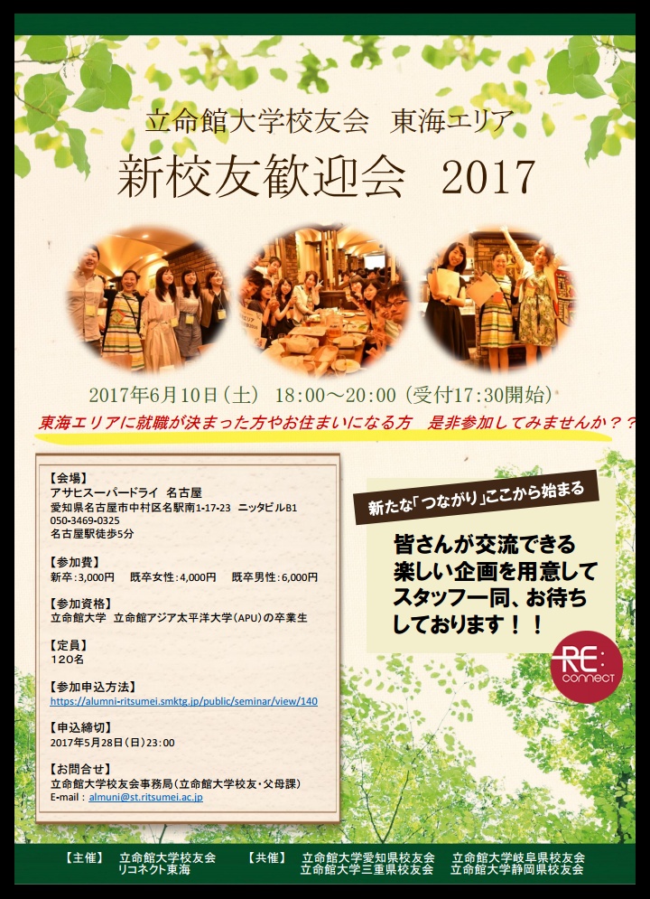 【お知らせ】リコネクト東海主催、新校友歓迎会が今年も6月に開催ですリコネクト東海より、新校友歓迎会の案内が届きました。
