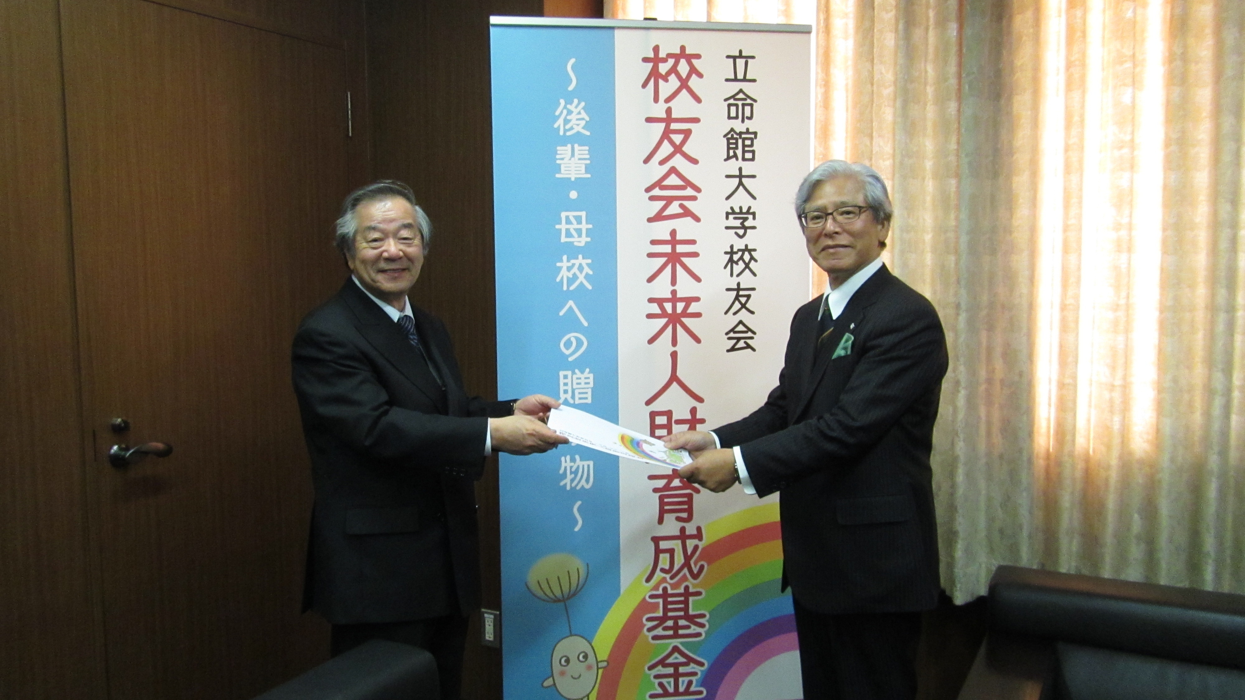 愛知県校友会イヤーズミーティング(11月18日)で寄せられた未来人材育成基金6万円が、11月24日、伊藤享司愛知県会長の名代で京都を訪れた林幸雄愛知県名誉会長から、村上健治校友会会長に届けられました。